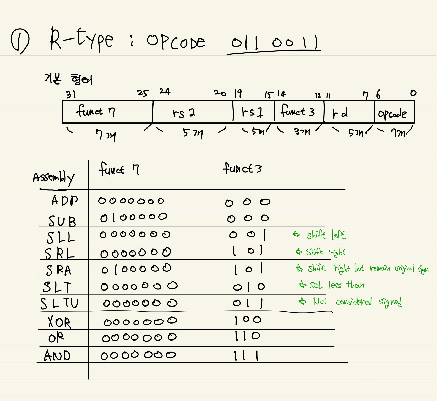 shift 연산시 사용되는 수로 총 5bit가 필요하다. 왜? reg bit 수는 총 32 bit 이기 때문이다. 따라서 일부 shift 연산 assembly 명령어는 Imm[11:5] 를 funct7로 사용하고 Imm[4:0]만 shamt로 사용한다.