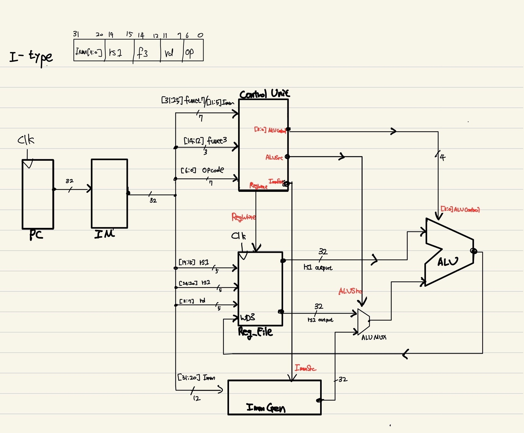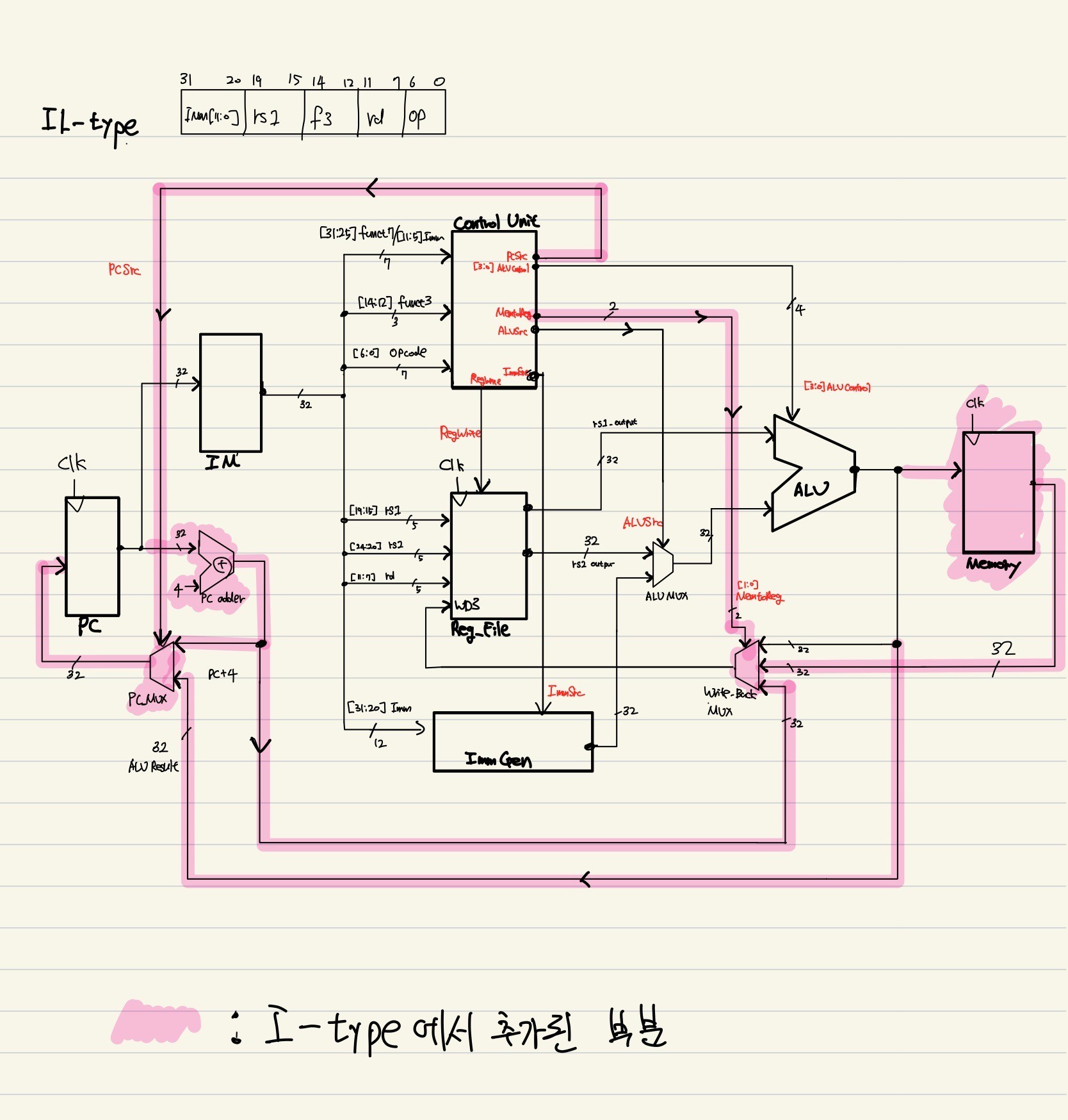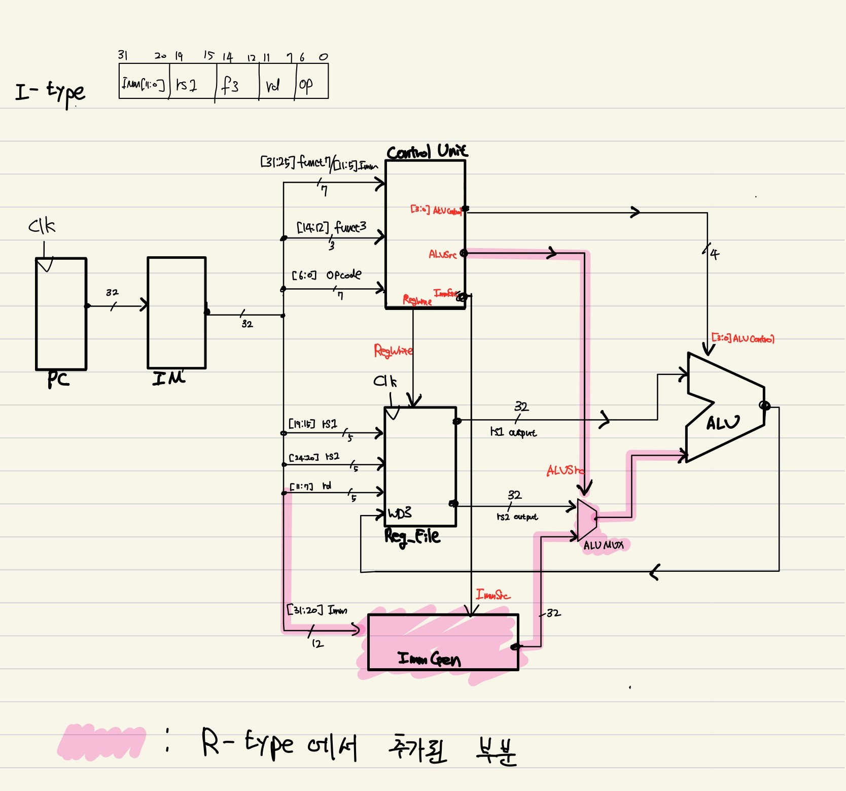 I-type은 IMM 값을 계산 인자로 사용하기에 ImmGen이라는 sign-extension 수행 block이 필요했다.