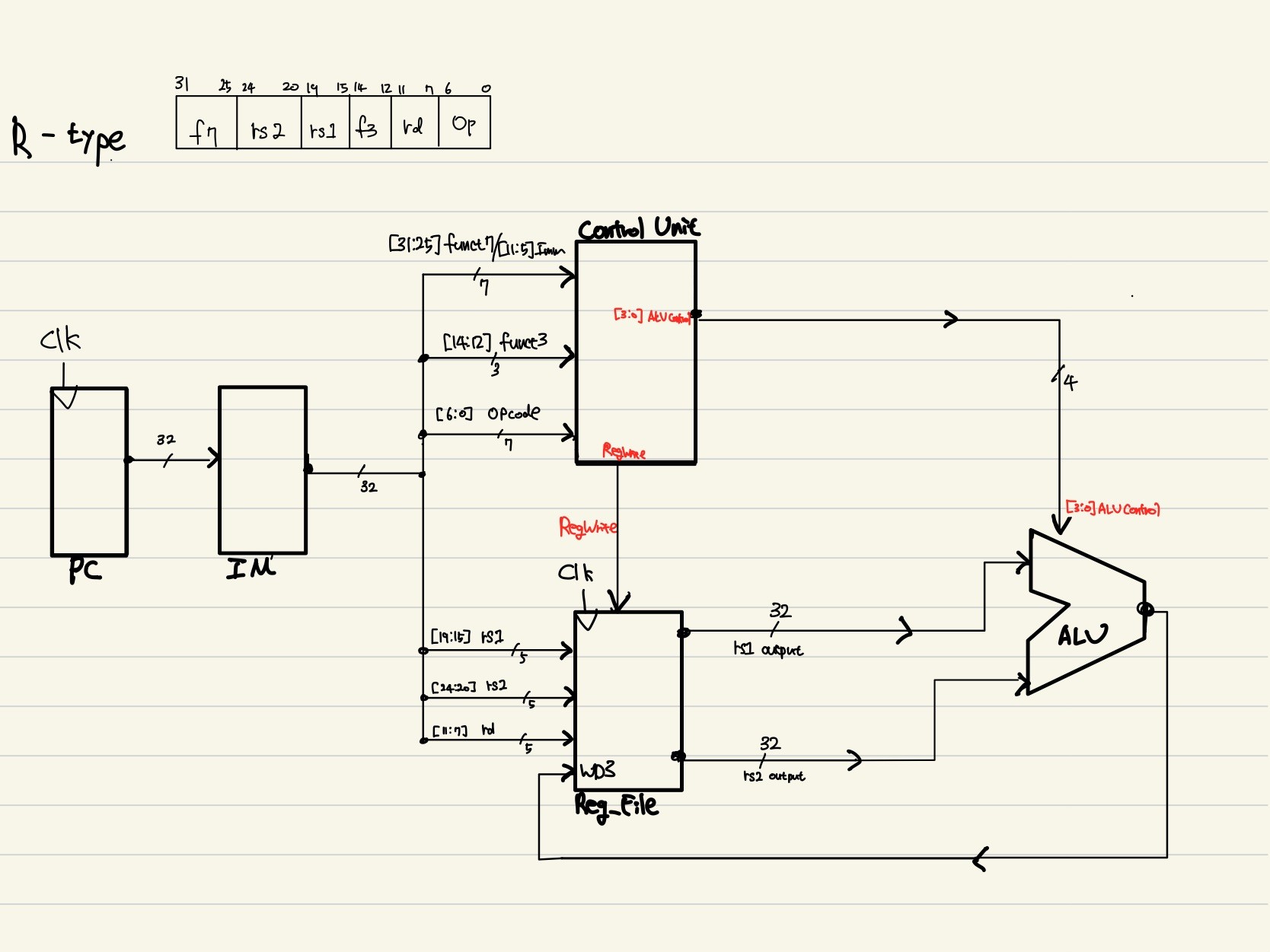 R-type 명령어는 memory access와 branch를 포함하지 않기 때문에, 가장 단순한 data path를 가진다. 이 data path를 바탕으로 Instruction type의 경로를 확장해 나간다.