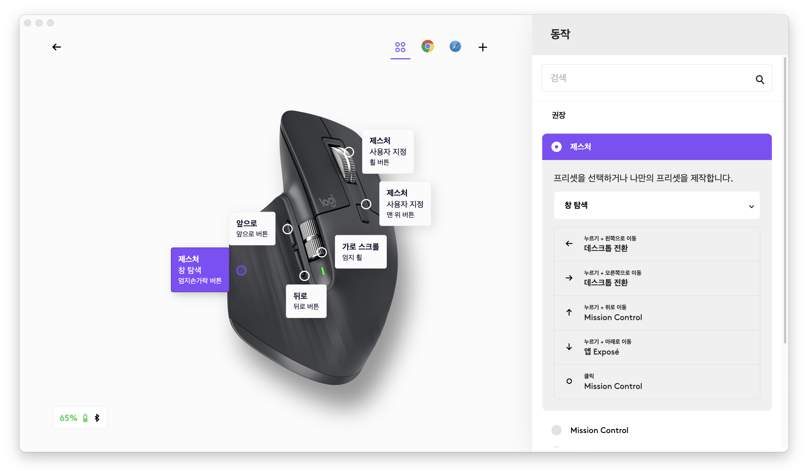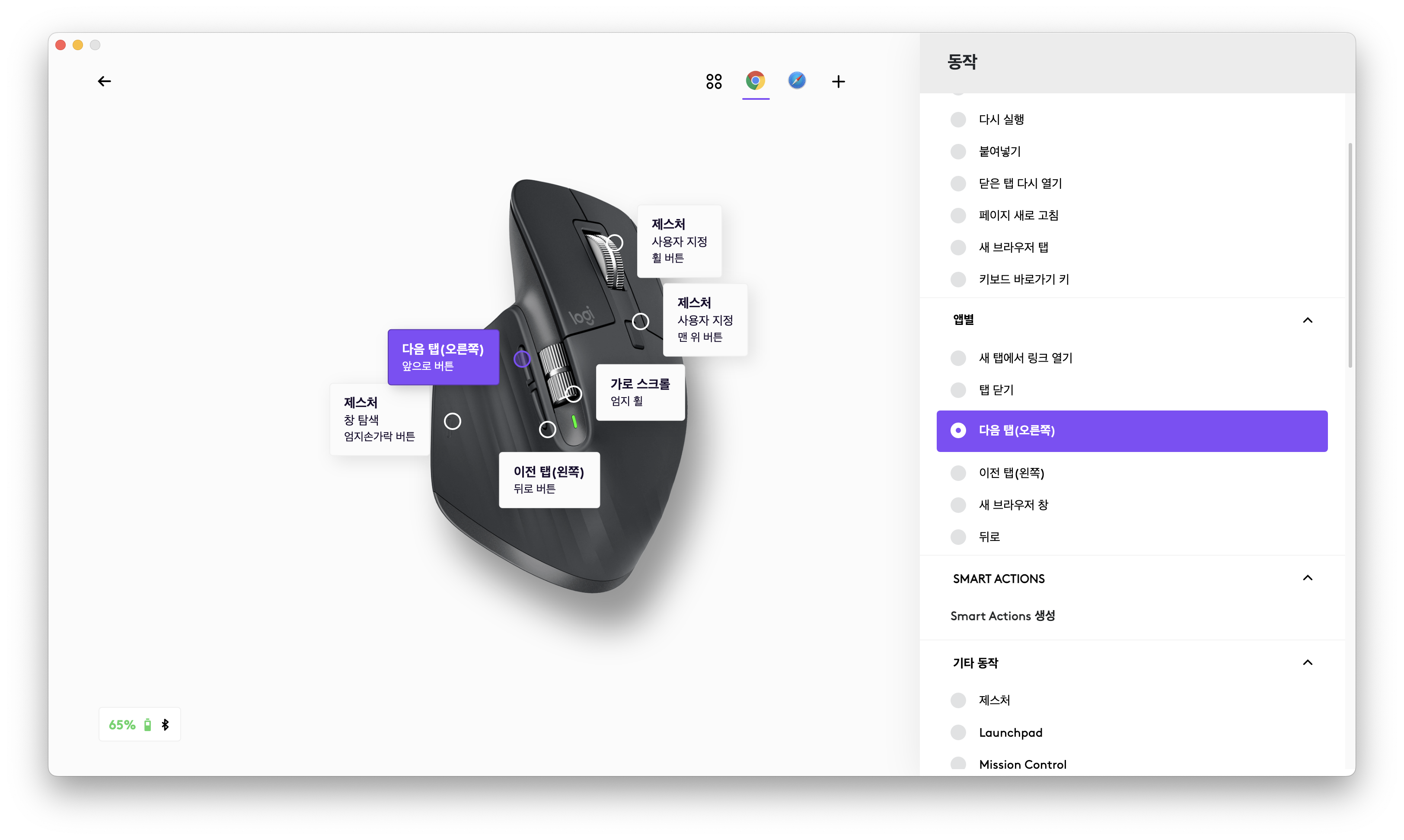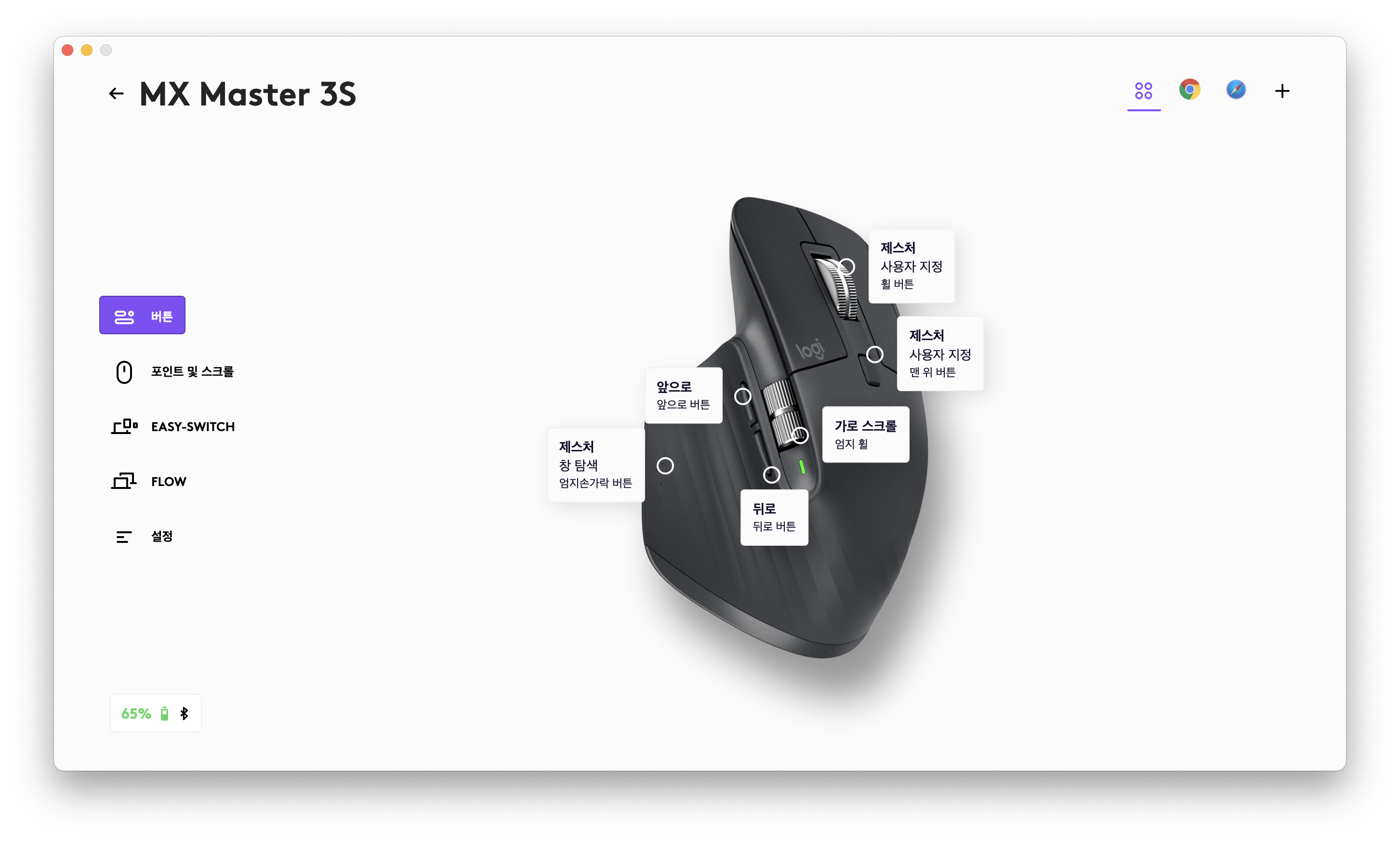 오른쪽 상단에 보면 크롬과 사파리 아이콘이 있는 것을 확인할 수 있다. 애플리케이션 별로 다르게 키를 커스텀할 수 있는 기능이다. 하지만 사용하다 보면 가끔 먹통이 될 때가 있는데, 이럴 때는 사용하던 애플리케이션을 껐다가 켜야 다시 제대로 동작한다는 단점이 있다. logi options+ 앱을 켜도 원하는 대로 동작하지 않음.