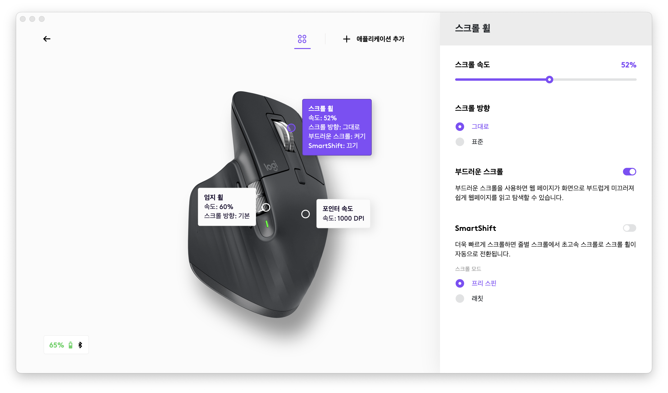 SmartShift 기능은 힘을 줘서 스크롤하면 래칫 모드에서 바로 초고속 스크롤 휠로 전환되는 기능이다. 굳이 사용하고 싶지 않아 해제하였다.