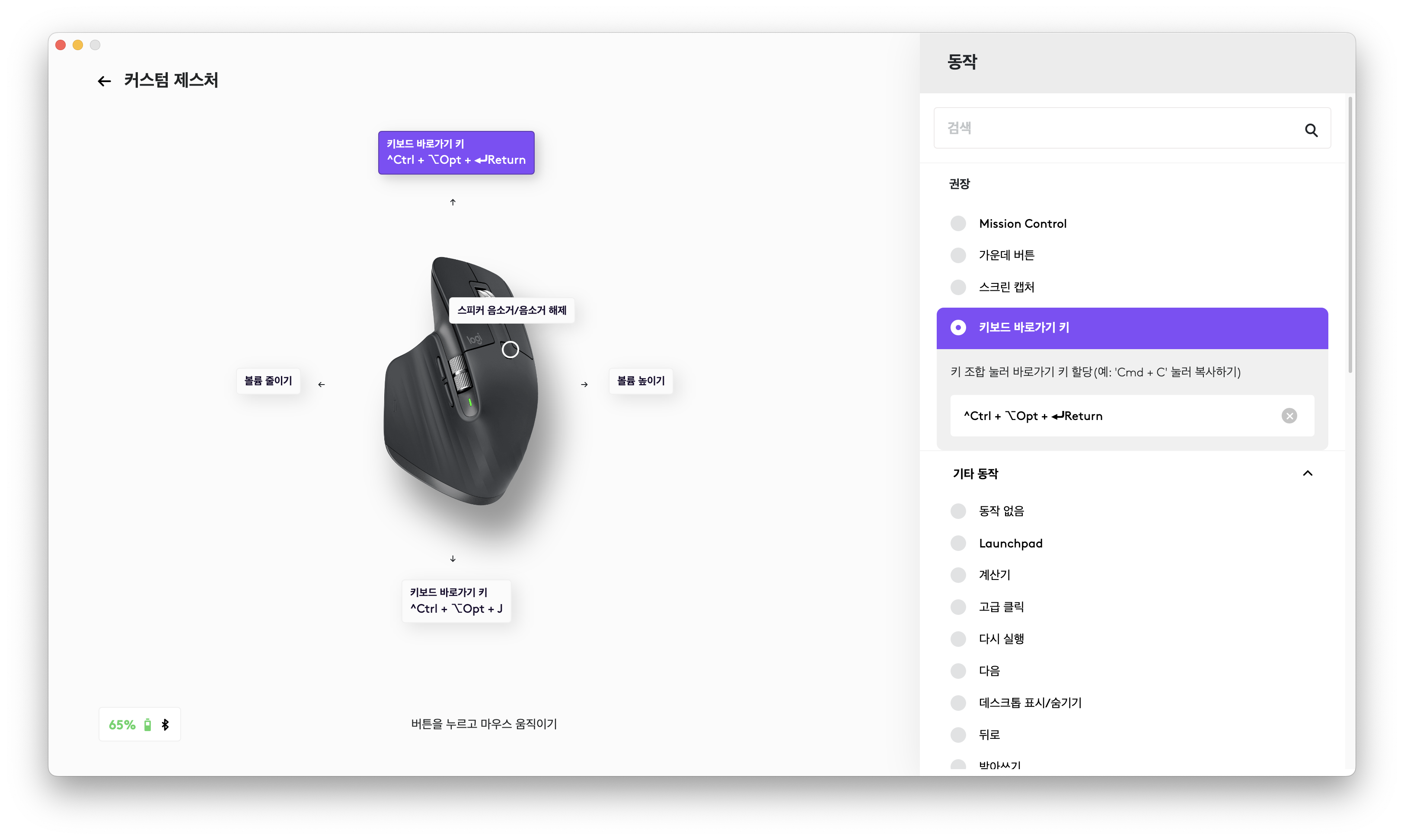 가운데 버튼(다른 마우스에서는 흔히 DPI 조절 버튼으로 알고 있는 그것)도 제스처를 사용하였다. 제스처 - 사용자 지정 을 선택하면 원하는 기능을 커스텀할 수 있다.