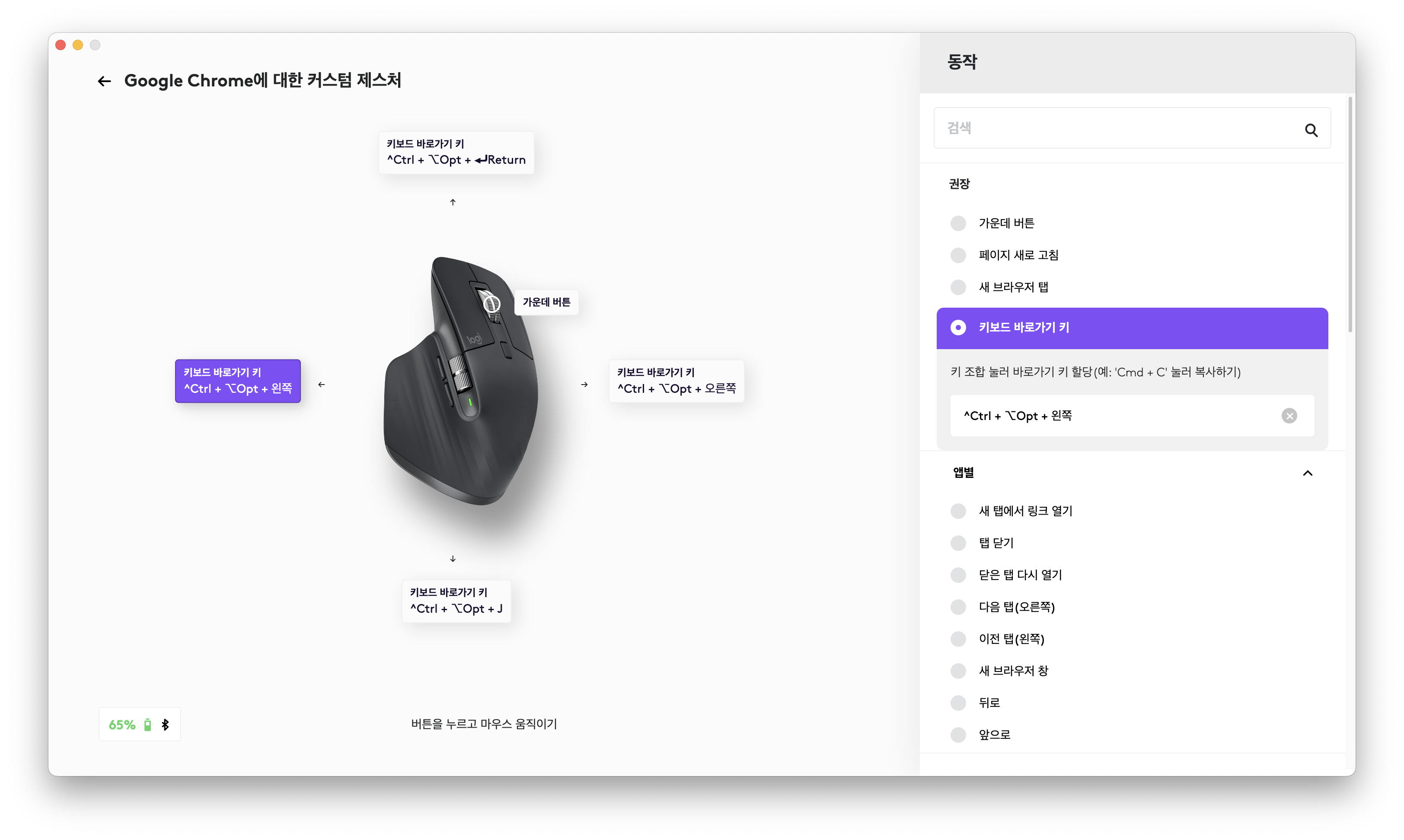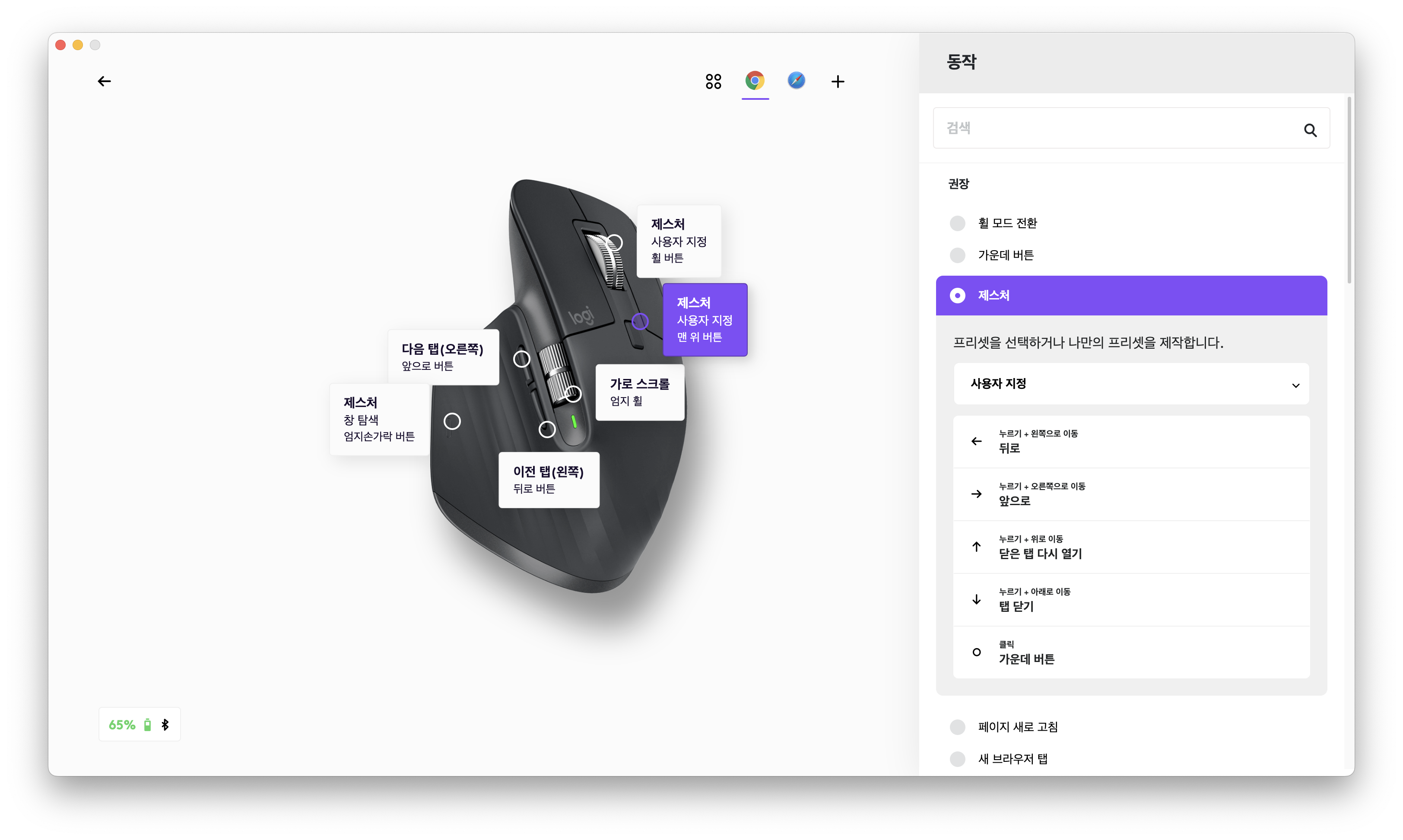 가운데 버튼은 다음과 같이 동작한다. 누른 채로 좌/우로 드래그 하면 뒤로/앞으로, 누른 채로 아래로 내리면 탭 닫기(Command+W), 위로 올리면 닫은 탭을 다시 열기(Shift+Command+T) 기능을 등록했다.