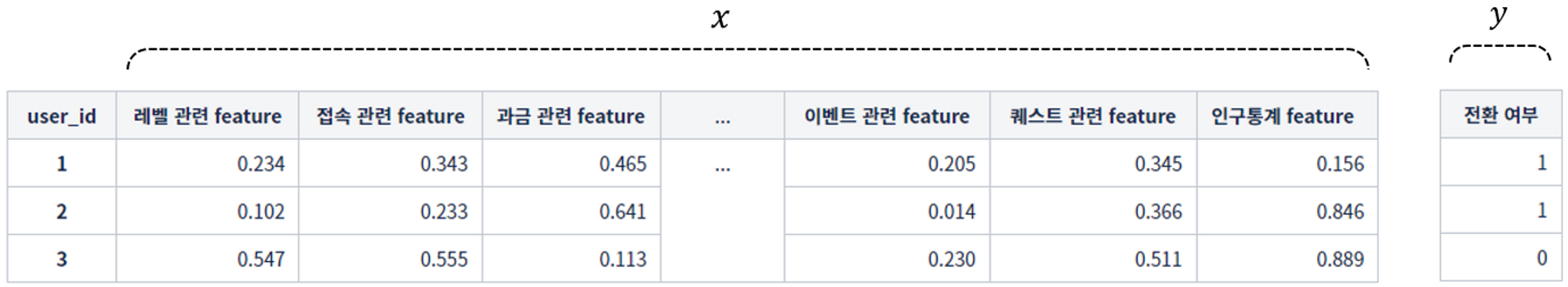 ② 테스트 캠페인 진행을 통해 얻은 정보는 광고 캠페인을 통해 획득한 유저별 전환 유무입니다. 즉, y label, 목표변수가 되겠죠.