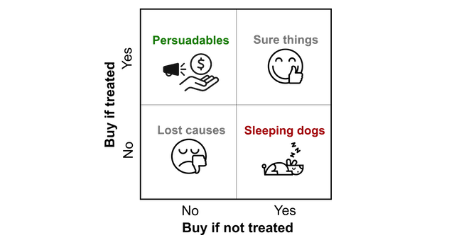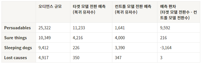 - Persuadables : 마케팅 개입(positive uplift)을 받았기 때문에 제품을 구매할 가능성이 더 높아진 고객입니다. 👉 목표대상!