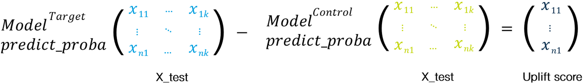 타겟군과 대조군에서 반응 확률의 차이를 통한 업리프트 모델링이며 응답 확률은 각 그룹에 대해 개별적으로 계산됩니다. (총 두가지 모델을 기반으로 접근)