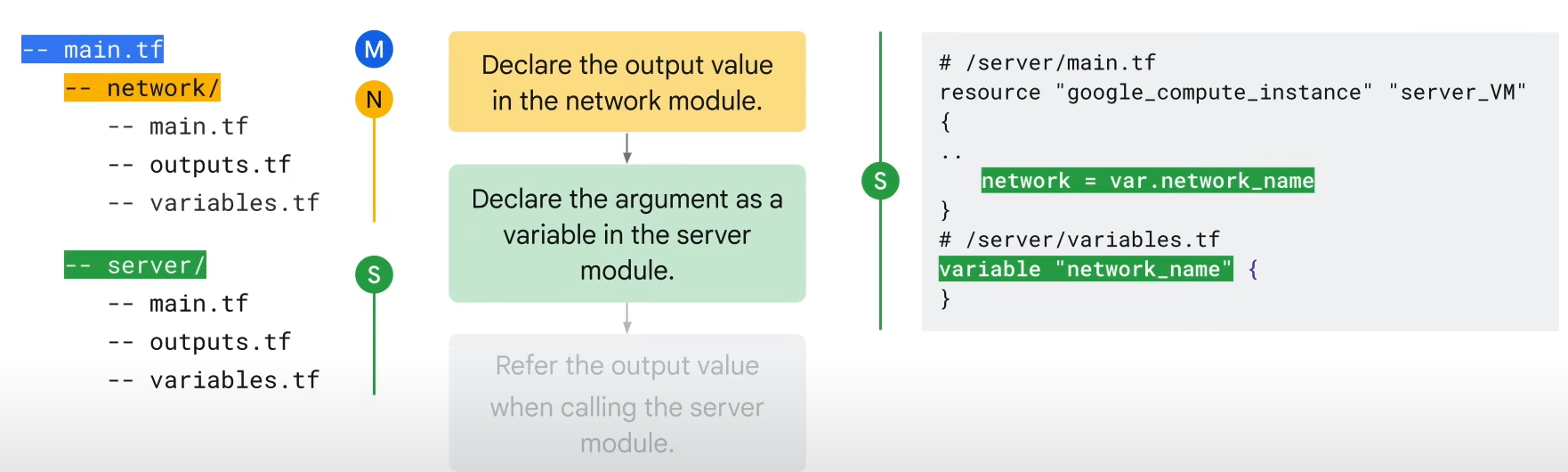 - To pass resource arguments, such as network names, from one module to another, use output values.
