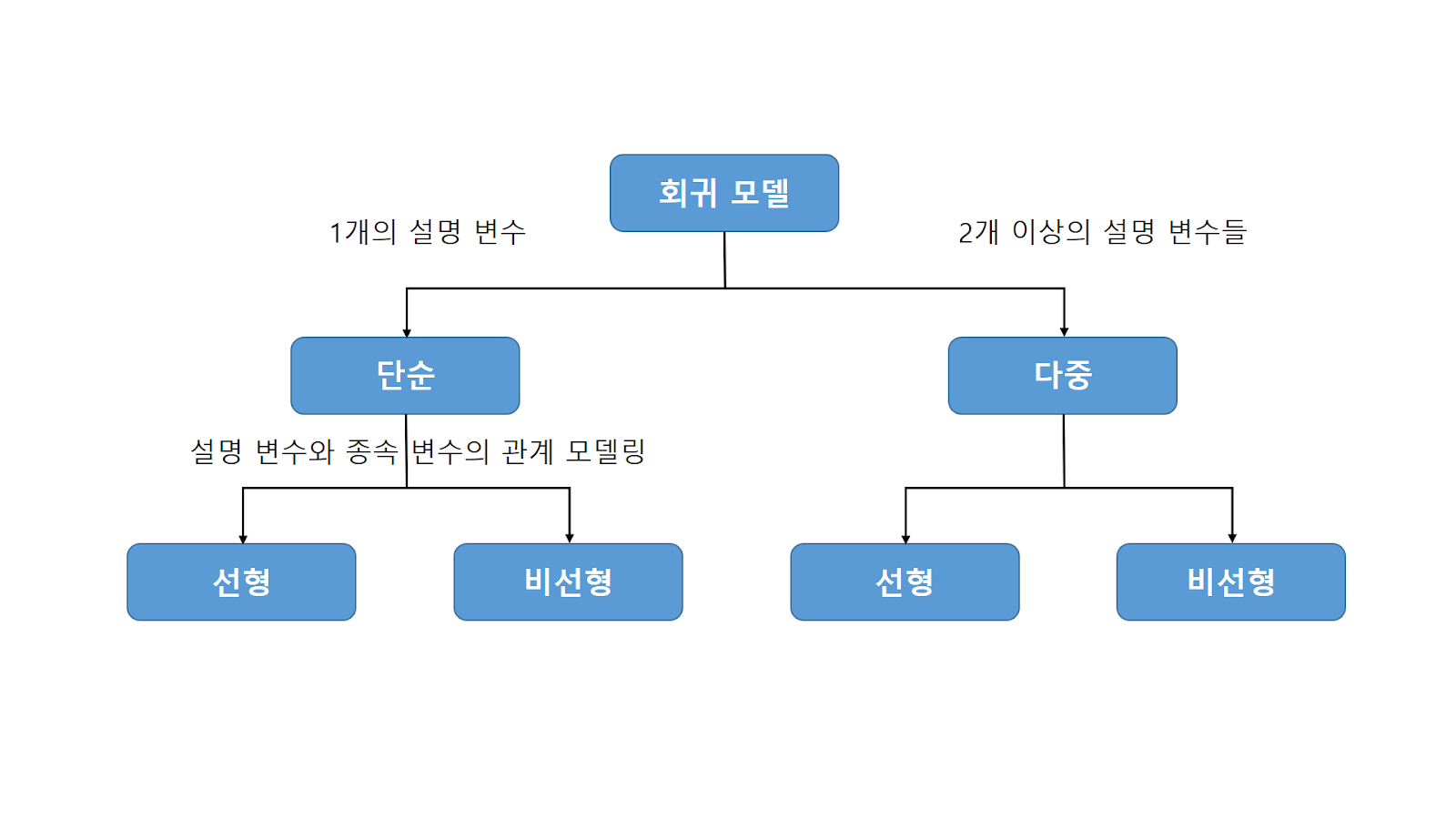 회귀모델은 위의 사진과 같이 구분을 할 수 있다. 독립변수가 1개이면 단순회귀(Simple Regression), 독립변수가 2개이상 이면 다중회귀(Multiple Regression)로 분류 할 수 있으며 각각을 또 두가지로 분류 할 수 있는데 회귀계수(기울기, x의상수값)가 선형이면 선형회귀, 비선형이면 비선형 회귀모델로 구분을 할 수 있다.