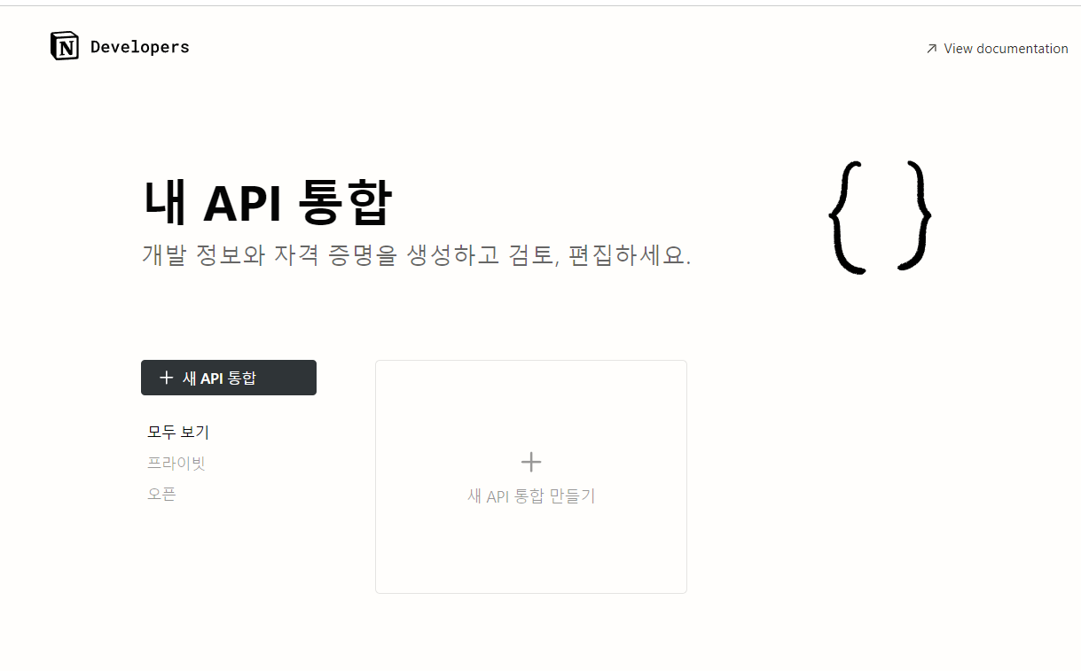 아래 사진에서 "새 API통합 만들기"를 클릭해서 API 토큰 번호를 저장하자.