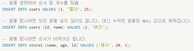 열 이름을 생략하고 순서와 개수를 맞추는 방법과 열을 명시하는 방법인데 열을 명시하는게 더 편한것 같다. 열을 명시하면 순서가 바껴도 되고 모든 열의 값을 넣지 않아도 된다.