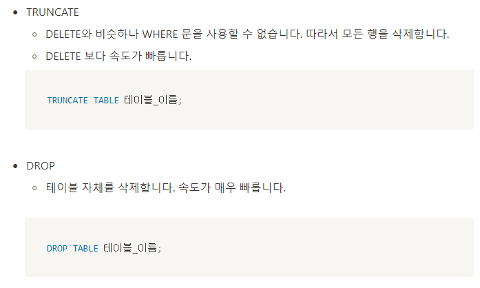 삭제하는 방법엔 테이블은 남겨두고 데이터만 삭제하는 TRUNCATE와 테이블을 삭제하는 DROP이 있다.