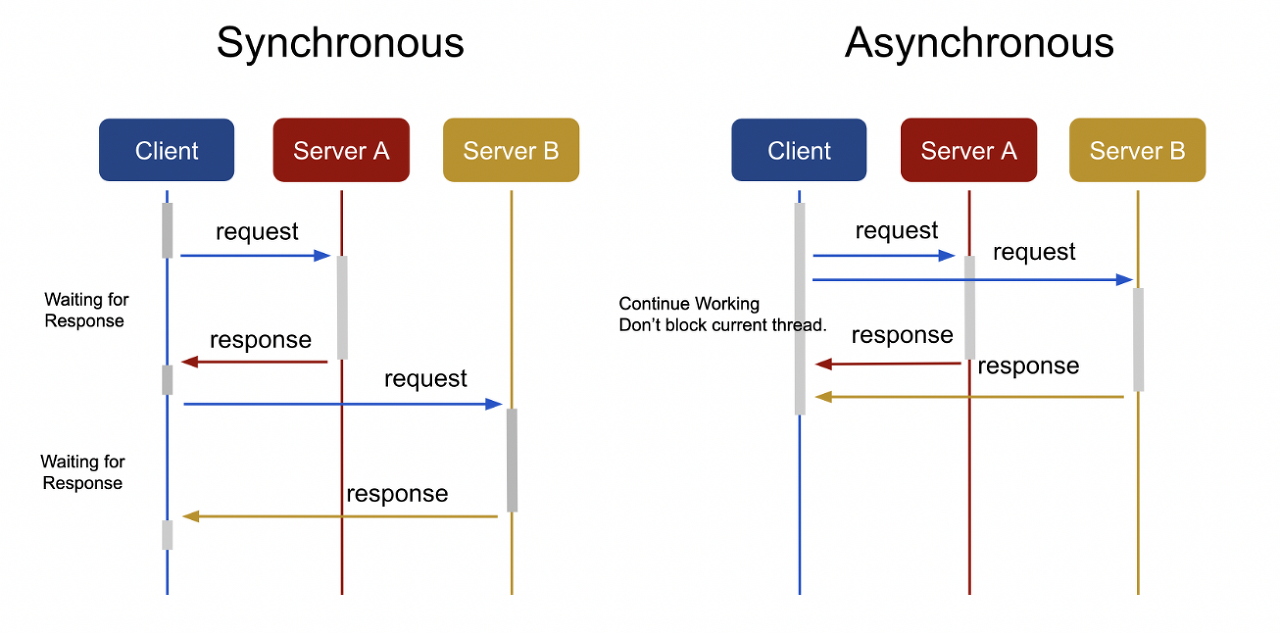 작업이 실행될 때, 해당 작업이 완료될 때까지 기다린다. 즉, 해당 작업이 끝나기 전까지는 다른 작업을 수행하지 않는다. 호출하는 함수가 호출된 함수의 작업이 완료되었는지를 계속 신경쓰고 있다.