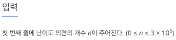 첫 번째 줄에 난이도 갯수 n이 주어지고 이어서 n개 만큼 난이도가 주어진다.
