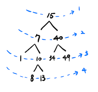 15 를 Queue 에 추가한다. (level = 1)Queue 에 추가된 값들을 모두 꺼내 합산 후 평균값을 구한다. (level = 1)15 의 자식 노드인 7, 40 을 Queue 에 추가한다.Queue 에 추가된 값들을 모두 꺼내 합산 후 평균값을 구한다. (level = 2)7, 40 의 자식 노드인 1, 10, 34, 49 를 Queue 에 추가한다.Queue 에 추가된 값들을 모두 꺼내 합산 후 평균값을 구한다. (level = 3)1, 10, 34, 49 의 자식 노드인 8, 13 을 Queue 에 추가한다.Queue 에 추가된 값들을 모두 꺼내 합산 후 평균값을 구한다. (level = 4)(엄연히 따지면 자식 노드는 아니다. 다음 레벨 정도로 이해하자.)
