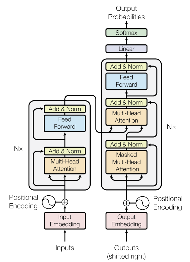 - Decoder: Decoder 또한 N=6의 동일한 레이어로 구성되어있음. Encoder와 비슷한 구조를 가지지만 Masked Multi-Head Attention 레이어를 추가함.