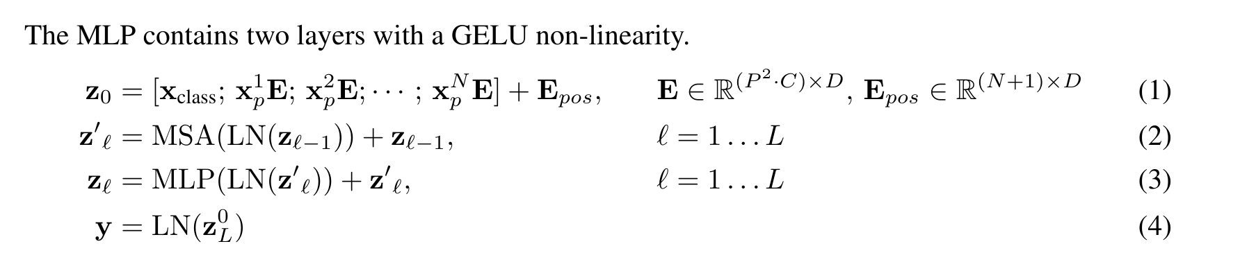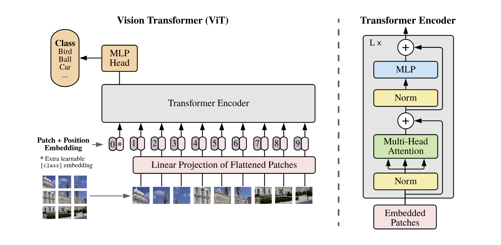 - NLP에서 쓰이는 Transformer구조와 최대한 비슷하게 Model을 디자인함. Encoder는 MSA(Multi-Self-Attention, MLP로 이루어져있음.