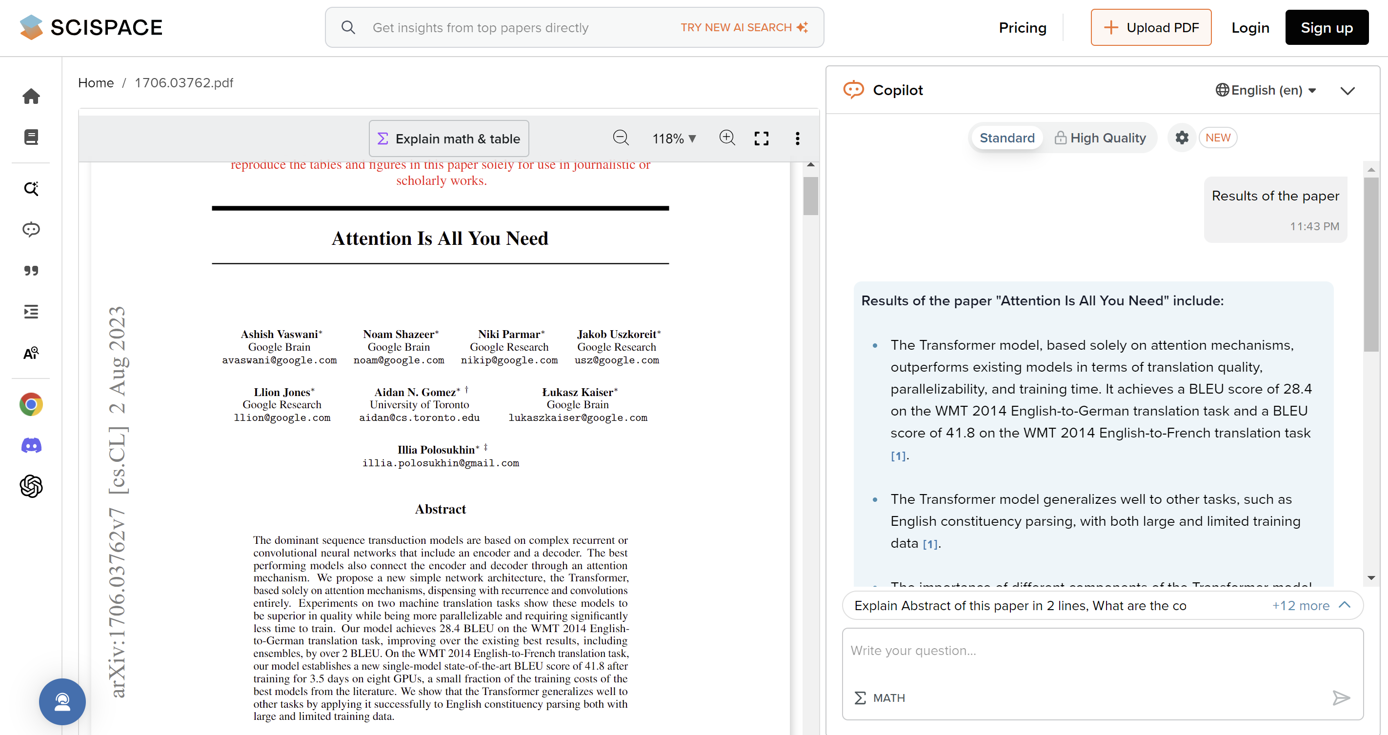 위와 같이 pdf파일을 업로드 한 후 이해가 되지 않는 부분이 생기거나, 논문을 제대로 이해했는지 파악하기 위해 내장 chatbot에게 질의응답을 할 수 있음.
