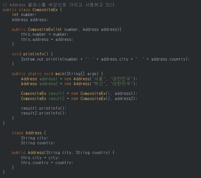 즉 클래스의 속성값에 다른 클래스를 선언하여 사용하는 것
