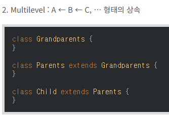 만약 아이클래스가 부모클래스로부터 상속을 받아왔다면 아이는 다른 상위클래스로 부터 중복으로 상속 받을 수 없음 부모가 여러명일 수 없는 것과 같다