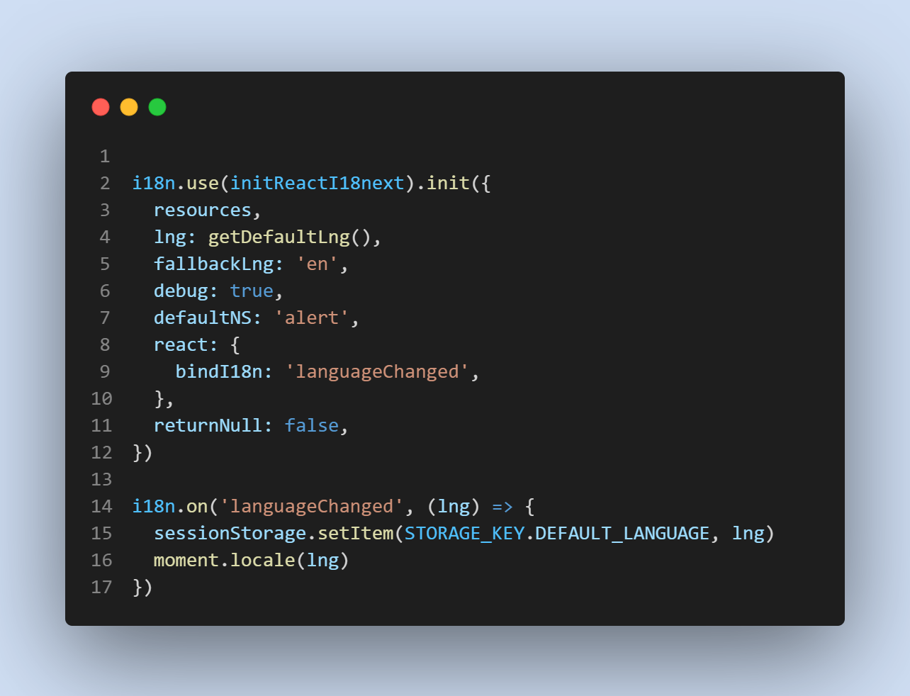 기본적으로 i18n.use.init으로 시작하게 된다. 아래에는 그 예시를 담아보았다.