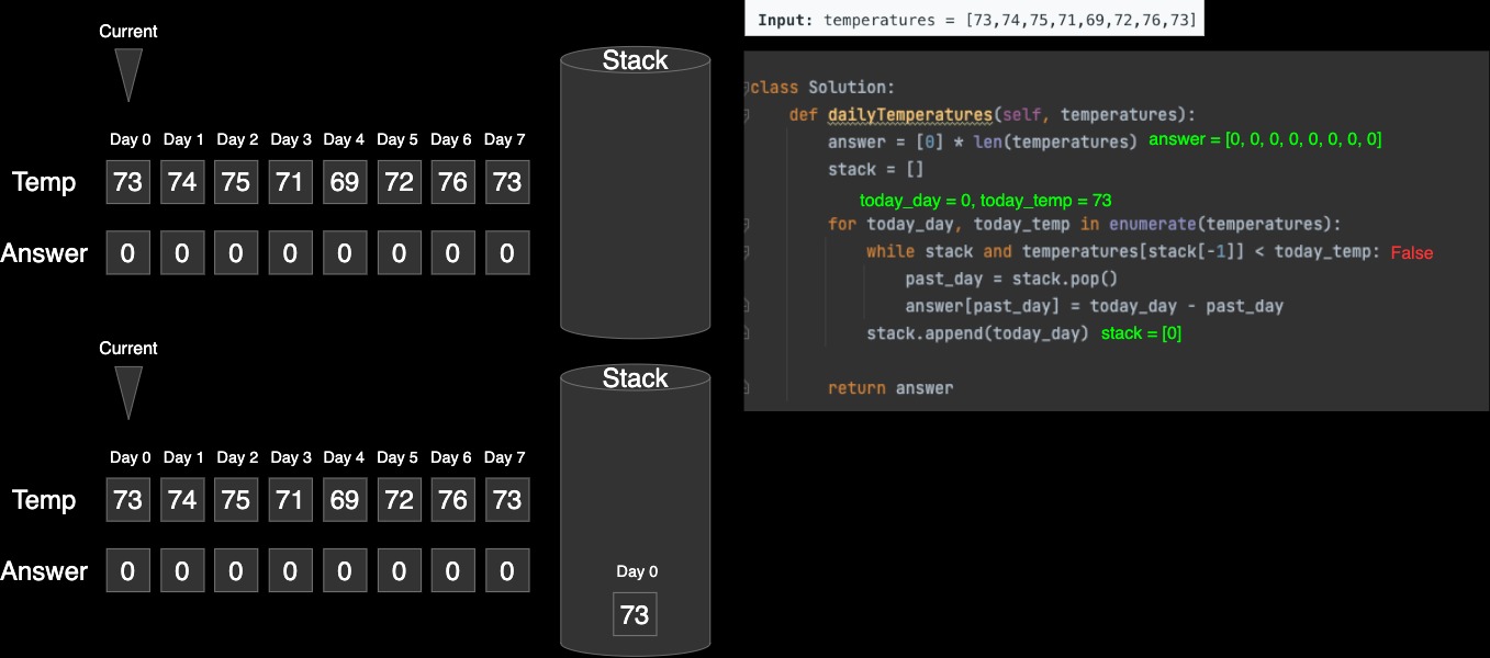 - 과거의 날과 오늘의 온도를 비교하여야 하기 때문에 데이터를 쌓아둘 스택을 배열로 선언해둔다.