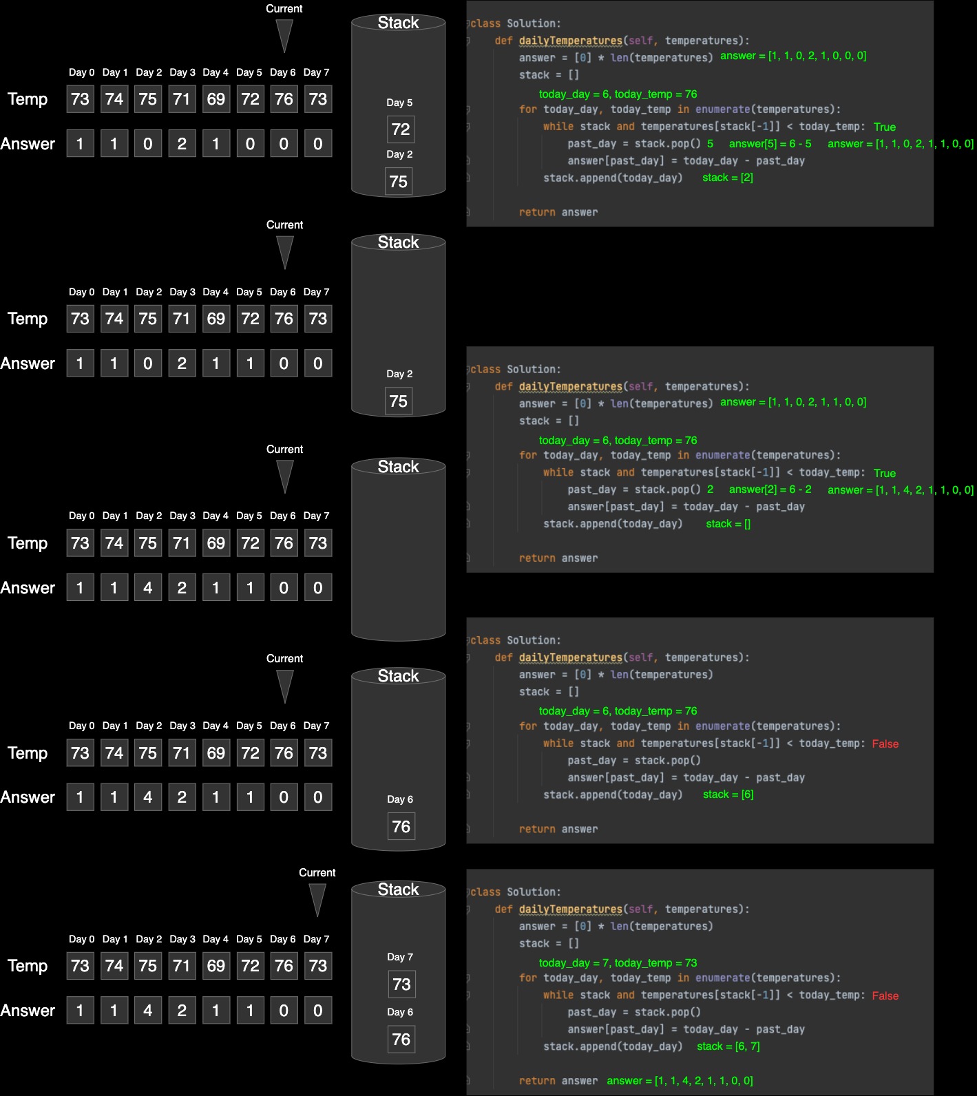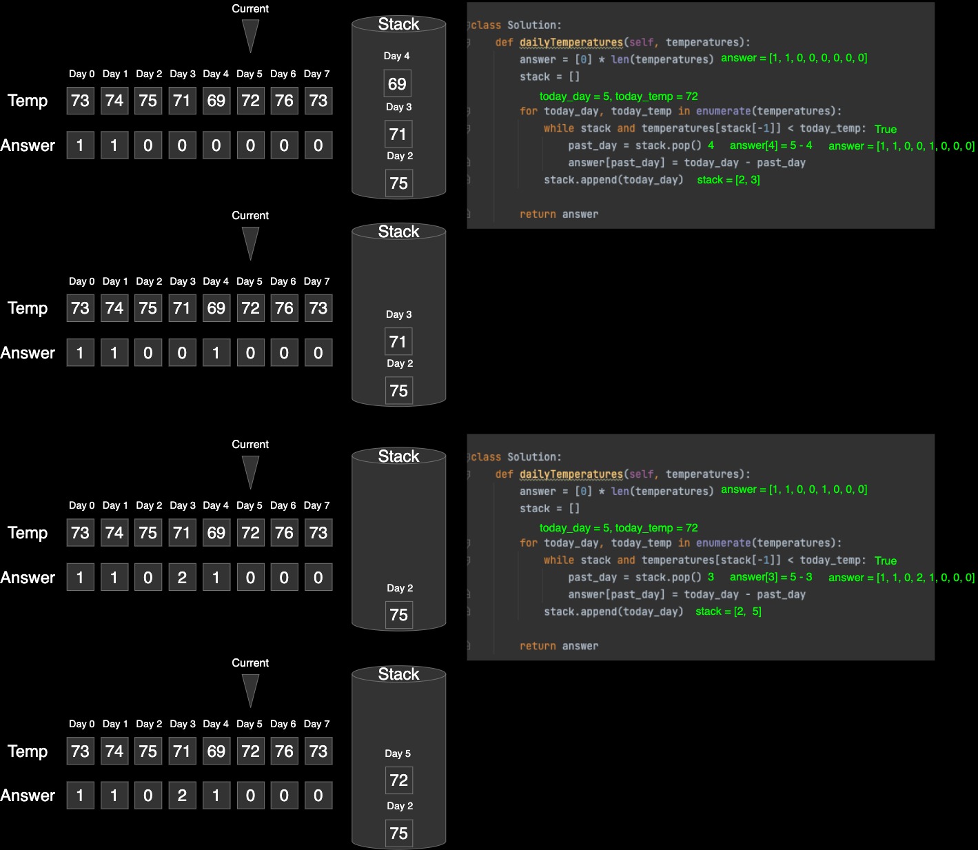 - for문안에서 while문을 도는데 stack이 있고, stack에 담긴 요일의 온도가 오늘의 온도보다 낮다면 오늘이 더 따뜻날이기 때문에 와일문이 돌게되고 온도를 비교한 요일을 pop()을 이용해 변수에 담아둔다.