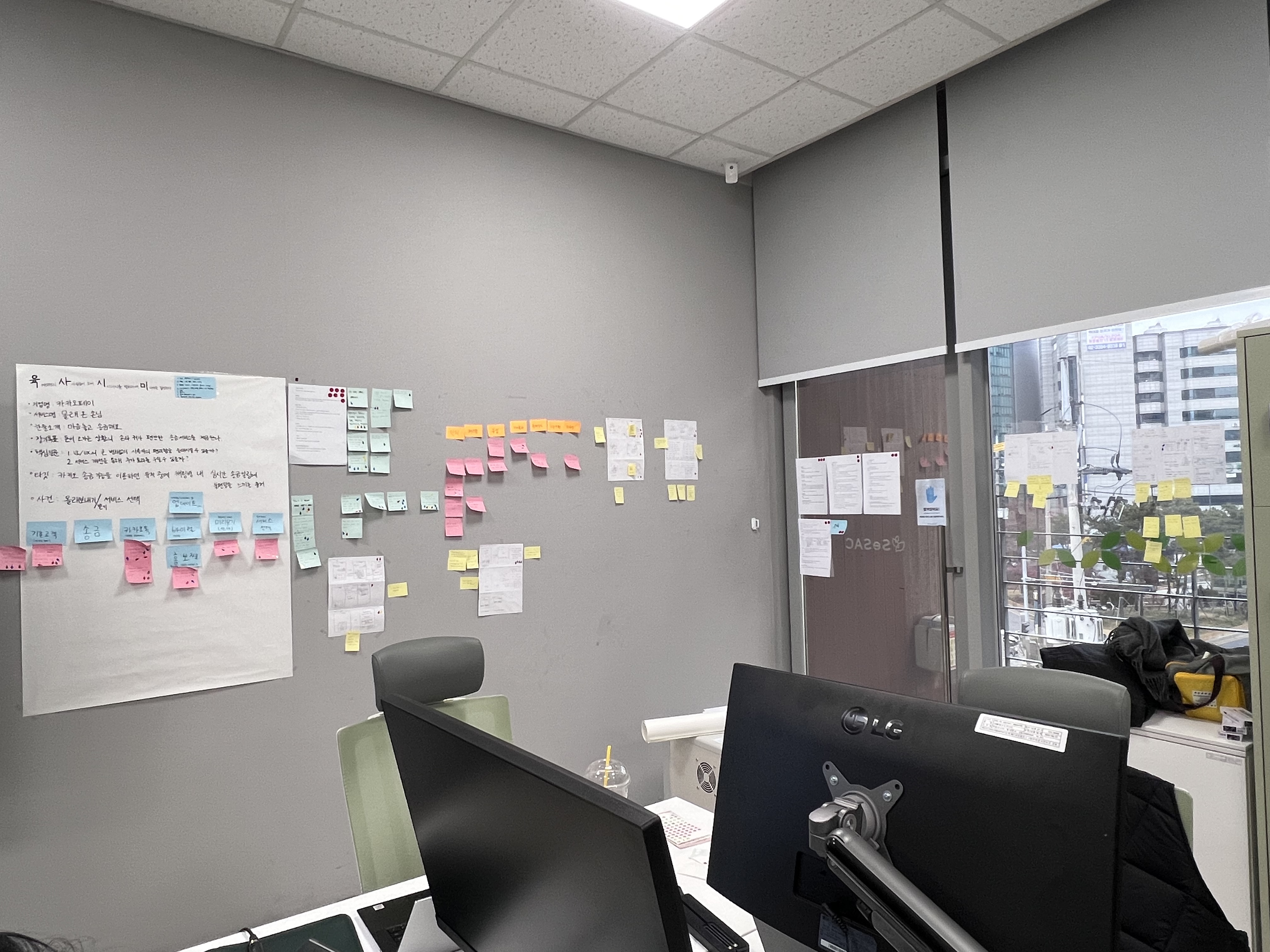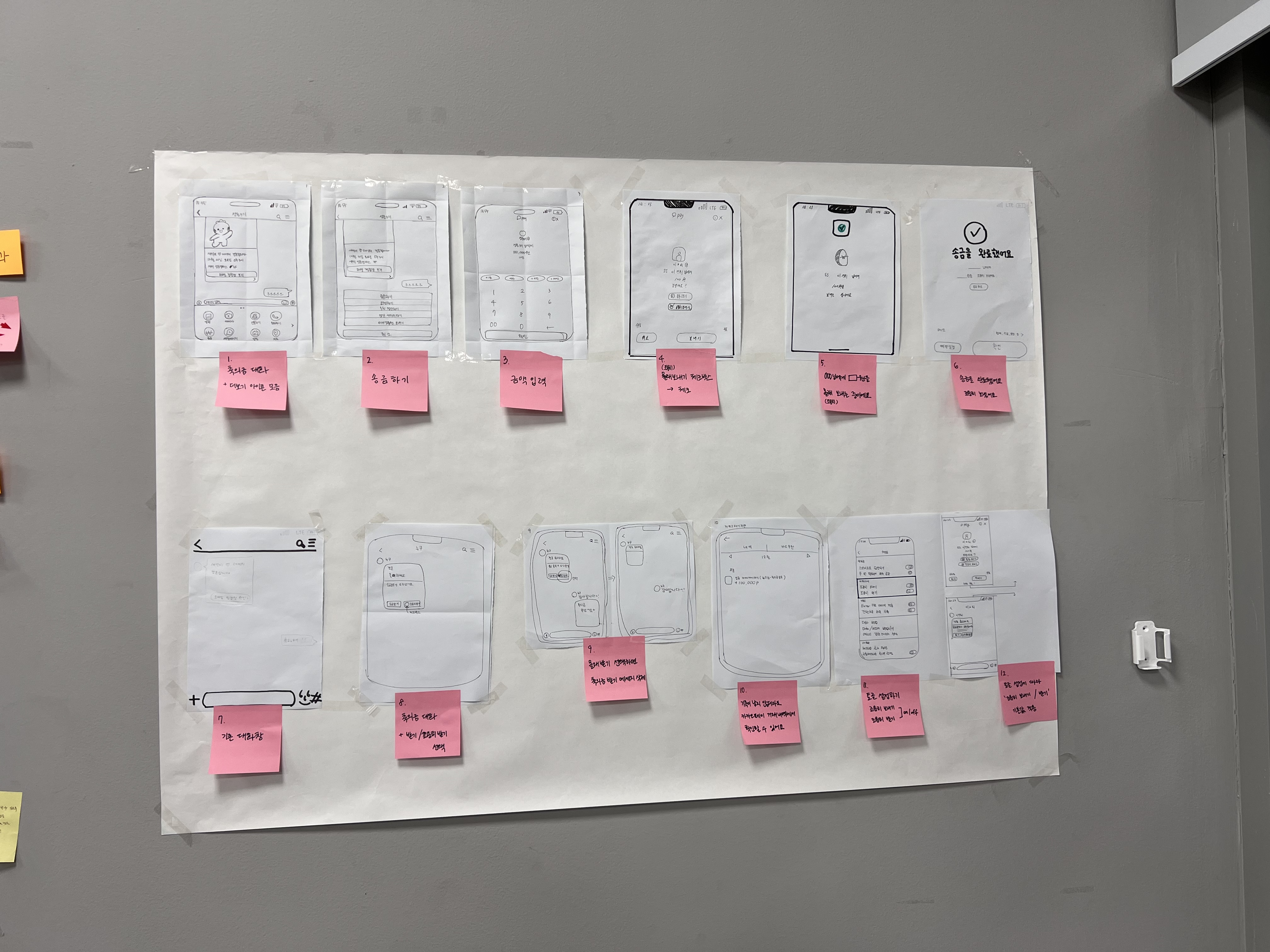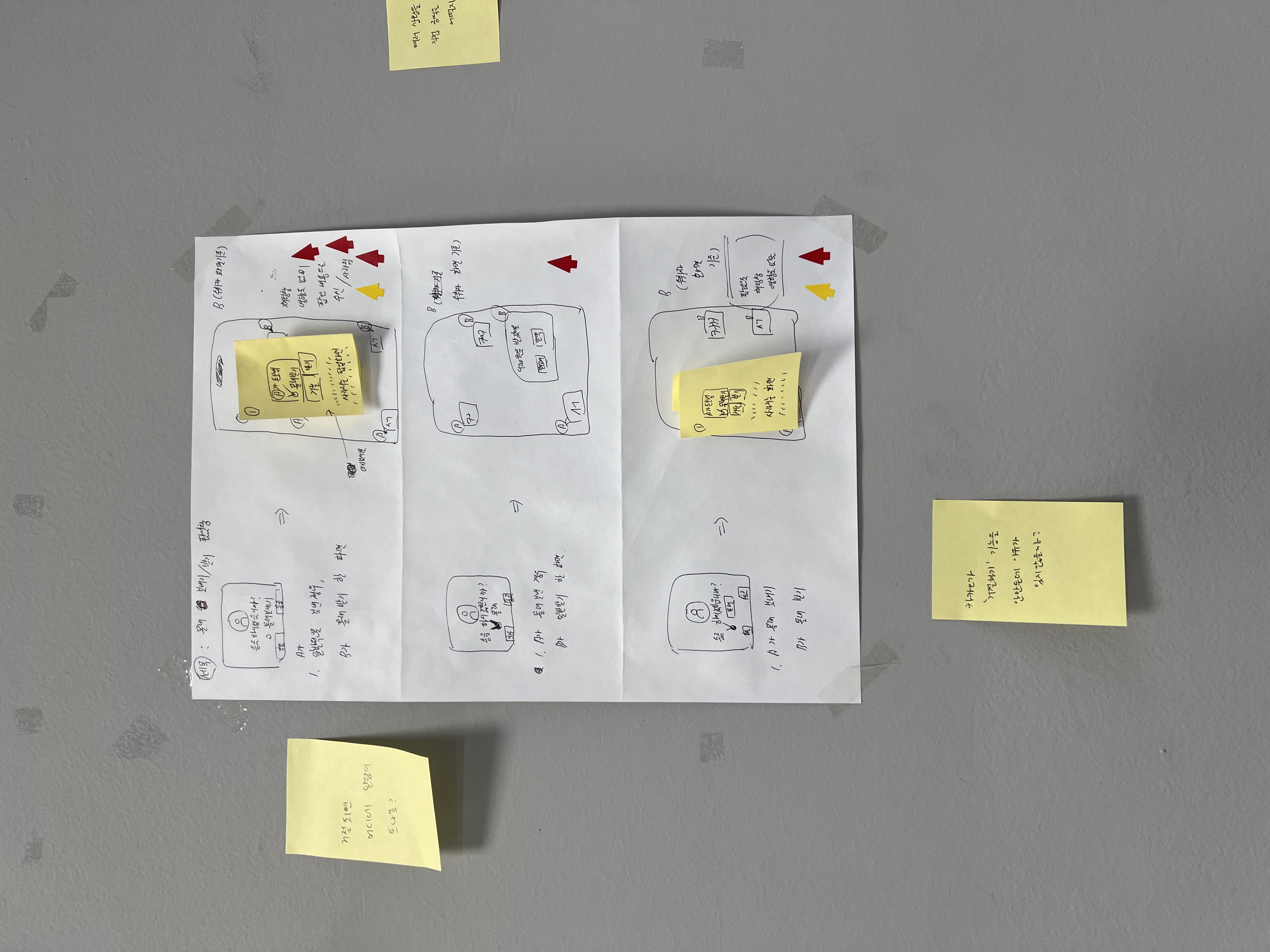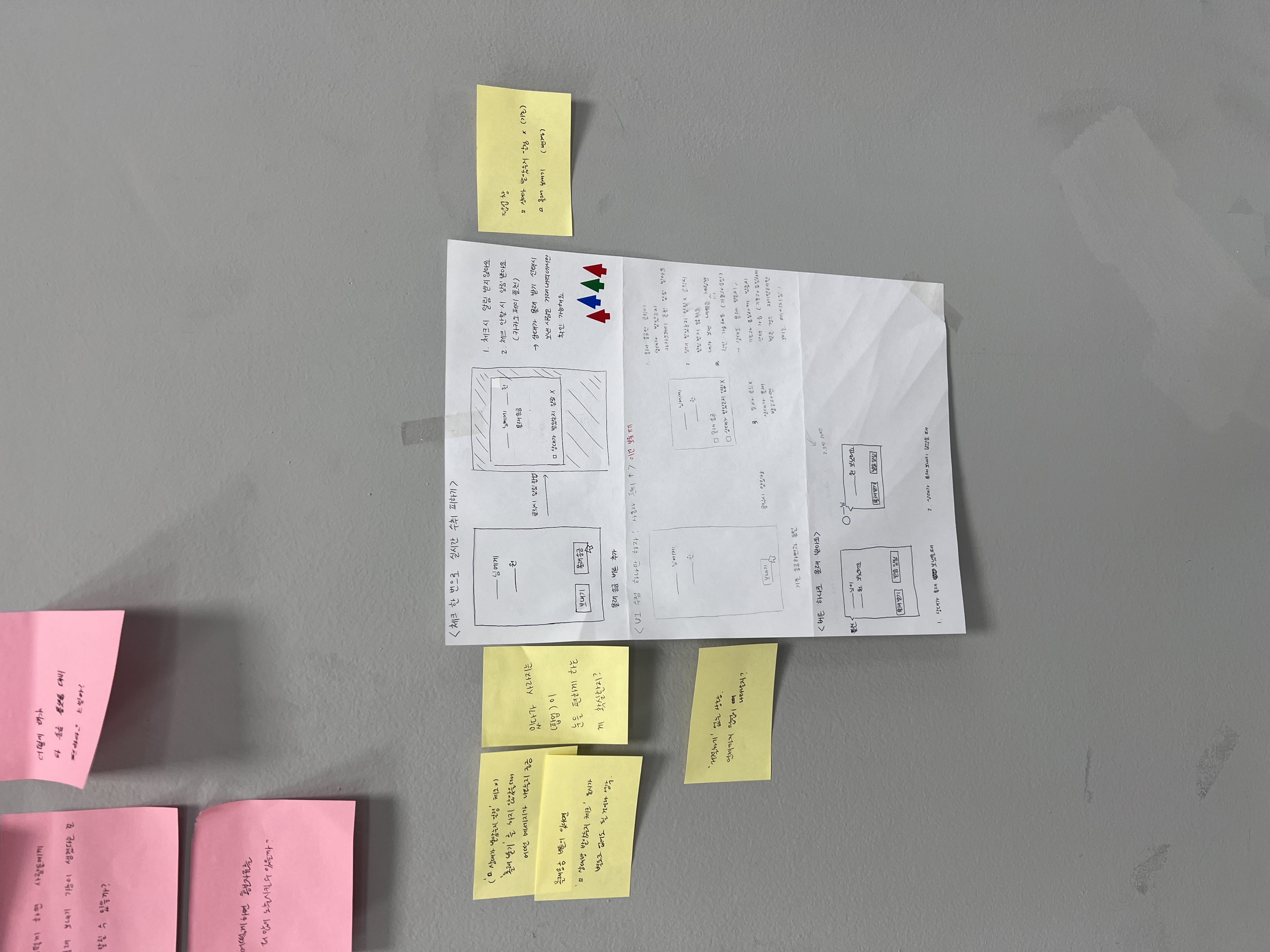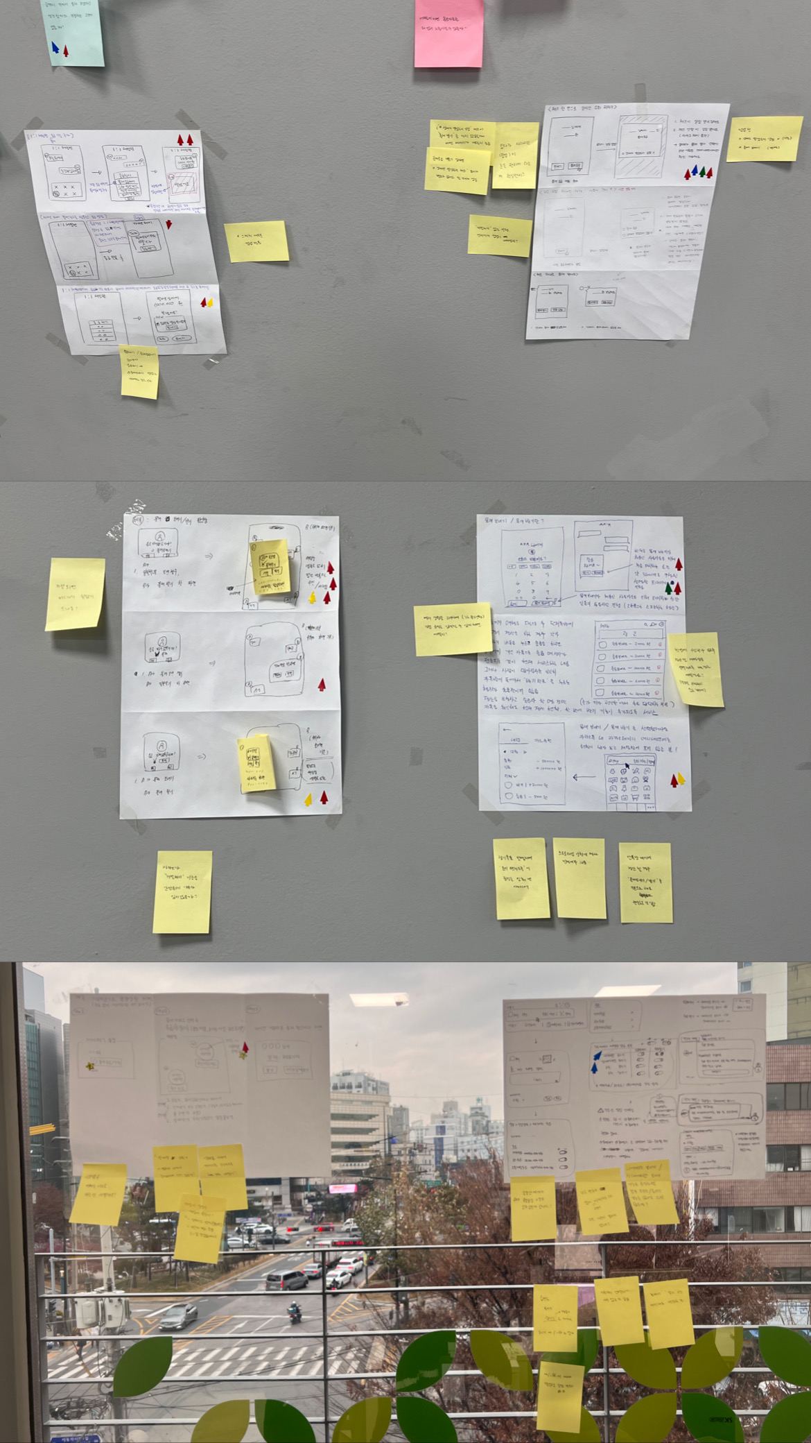 팀원 각각 개별 솔루션 스케치 테이프로 벽에 붙이기