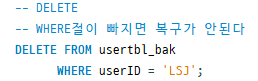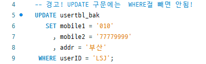 WHERE절 생략 가능하나 WHERE절 생략하면 테이블의 전체 행의 내용 변경됨