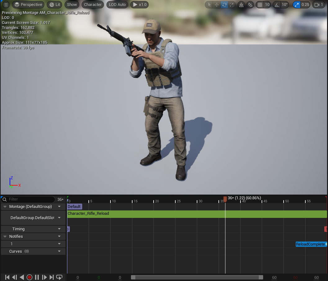 Reload Animation은 어떤 상태에 따라 재생되는 것이 아닌 특정 동작마다 재생되는 Animation이므로 Animation Montage로 생성하여 Reload 마다 재생되도록 설정.