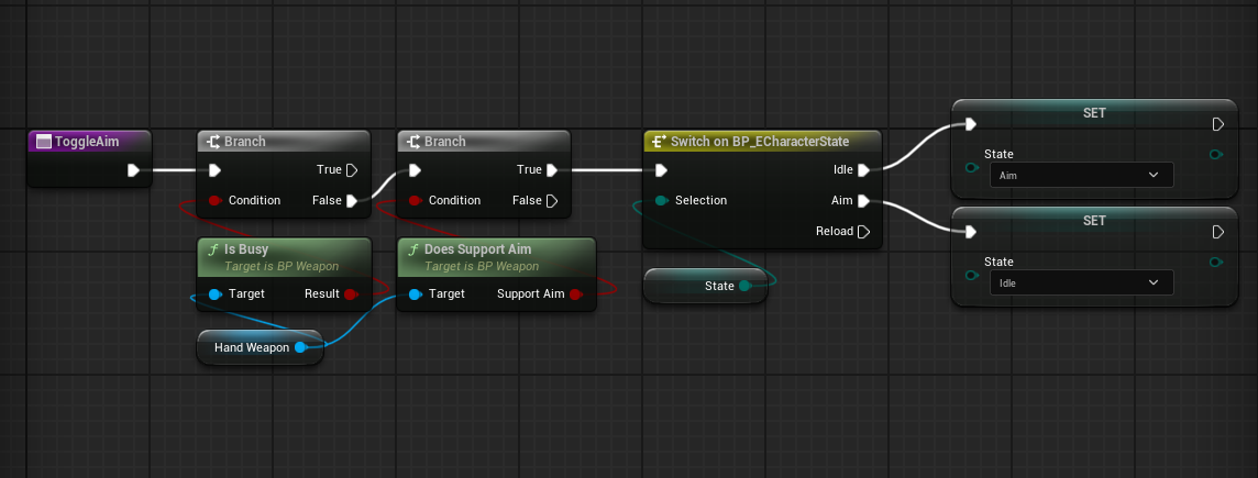 Main Weapon은 마우스 우클릭 Event가 발생하면 현재 상태를 Aim State로 변경하며, Idle에서 Aim 상태로 전환, Aim에서 다시 마우스 우클릭 Event가 발생하면 Idle로 전환.