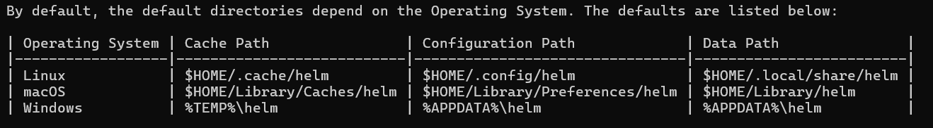 helm help 명령어를 실행하면 Helm이 사용하는 설정, 데이터, 캐시 디렉터리 경로를 확인할 수 있다.