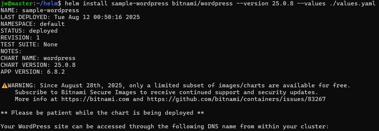 helm install sample-wordpress bitnami/wordpress --version 25.0.8 --values ./values.yaml