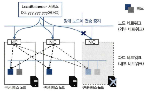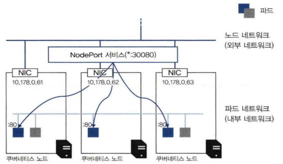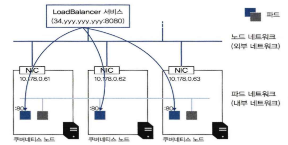 동작 구조: 외부 로드 밸런서 -> 모든 노드의 NodePort -> 파드(Pod) 순서로 트래픽이 전달된다.