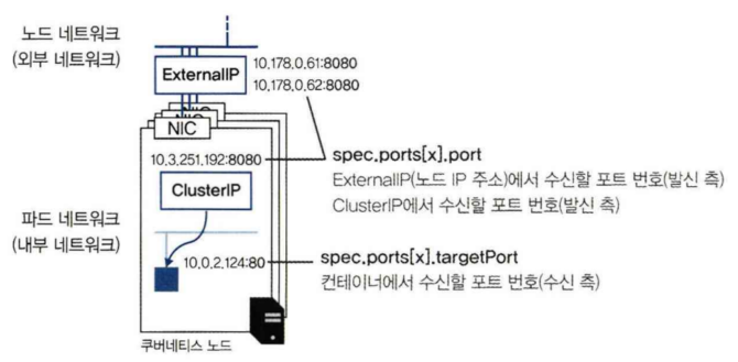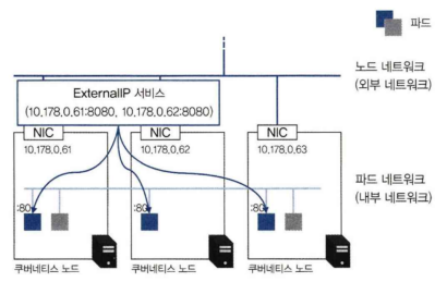 ExternalIP 는 별도의 서비스 타입(Type)이라기보다는, ClusterIP 등의 타입에서 사용할 수 있는 설정에 가깝다. 지정된 특정 노드의 IP 주소로 들어오는 트래픽만 허용하여 파드로 전달한다.