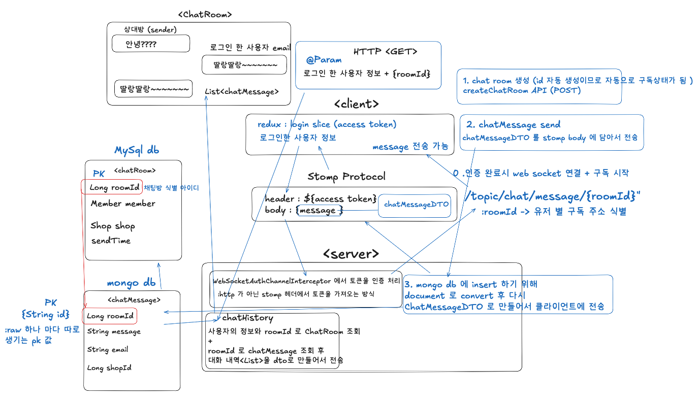유저가 메세지를 보내면 stomp 프로토콜의 body 에 메세지가 담겨서 서버( /topic/chat/message/{roomId}" 주소 )에 전달됨 ( STOMP )