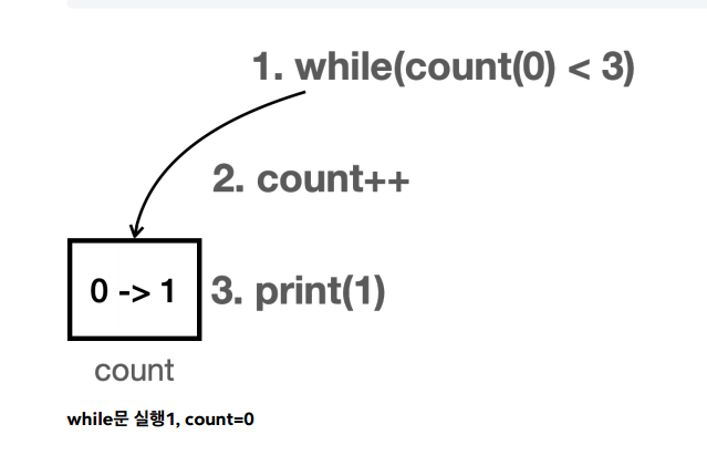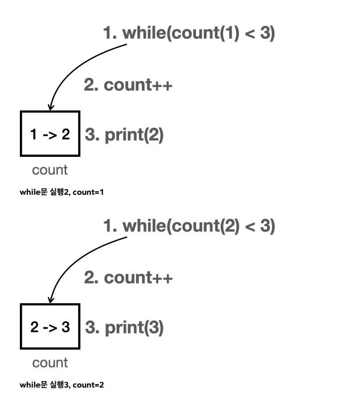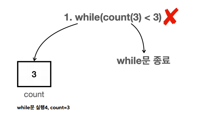 while (count < 3) 에서 코드 블럭을 반복 실행한다. 여기서 count 의 값이 1 , 2 , 3 으로 점점 커지다가 결국 count < 3 이 거짓이 되면서 while 문을 빠져나간다.