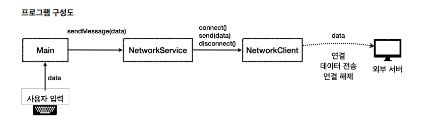 NetworkClient : 외부 서버와 연결하고, 데이터를 전송하고, 연결을 종료하는 기능을 제공한다.NetworkService : NetworkClient 를 사용해서 데이터를 전송한다. NetworkClient 를 사용하려면 연결, 전송, 연결 종료와 같은 복잡한 흐름을 제어해야 하는데, 이런 부분을 NetworkService 가 담당한다.Main : 사용자의 입력을 받는다.Main 을 통해 사용자의 입력을 받으면 사용자의 입력을 NetworkService 에 전달한다.NetworkService 는 NetworkClient 를 사용해서 외부 서버에 연결하고, 데이터를 전송하고, 전송이 완료되면 연결을 종료한다.NetworkService 예시 코드
