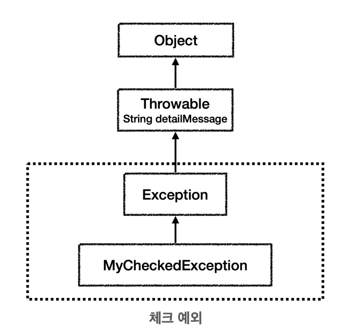 MyCheckedException 는 Exception 을 상속받았다. Exception 을 상속받으면 체크 예외가 된다.RuntimeException 을 상속받으면 언체크 예외가 된다. 이런 규칙은 자바 언어에서 문법으로 정한 것