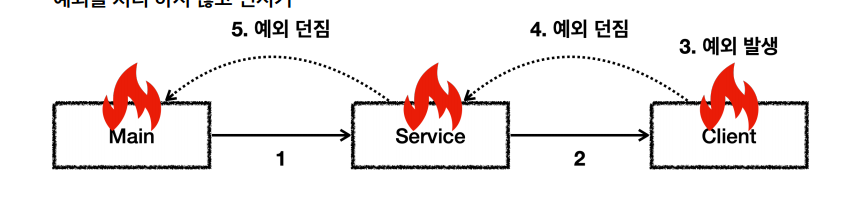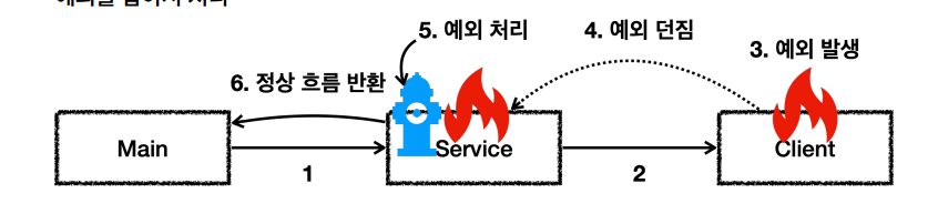 main() -> service.callCatch() -> client.call() [예외 발생, 던짐]main() <- service.callCatch() [예외 처리] <- client.call()main() [정상 흐름] <- service.callCatch() <- client.call()Client.call() 에서 MyCheckedException 예외가 발생하고, 그 예외를 Service.callCatch() 에서 잡는