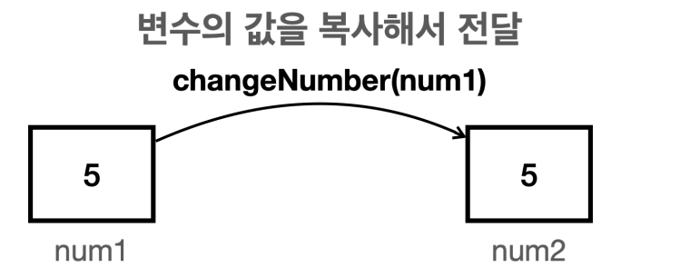 num2 의 변경은 num1 에 영향을 주지 않는다. 왜냐하면 앞서 값을 복사해서 전달했기 때문이다.