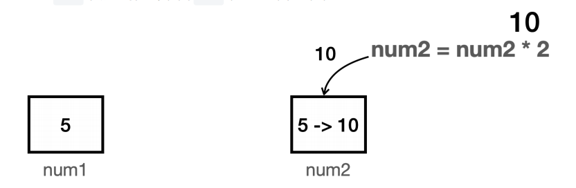 num2 = num2 * 2; //num2에 2를 곱한다. 결과: num1(5), num2(5)