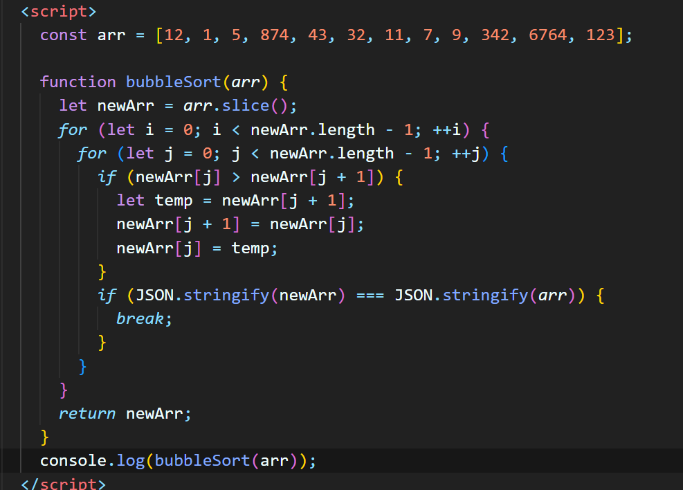 따라서, 안 쪽 for문이 한 번 작동이 끝났을 때 if문으로 어떤 요소도 위치가 바뀌지 않은 경우, break로 바깥for문이 더 이상 작동하지 않도록 해주었다.
