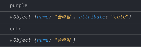 그 다음에는 purpleCuteSlime 이라는 객체를 만들었다, 이 객체는 cuteSlime 이 가지고 있는 속성을 그대로 사용하면서 추가적으로 color 가 추가되었다.