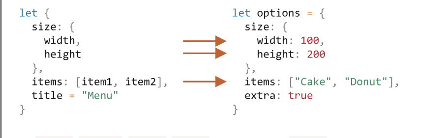let {height, width, title} = { title: "Menu", height: 200, width: 100 }
