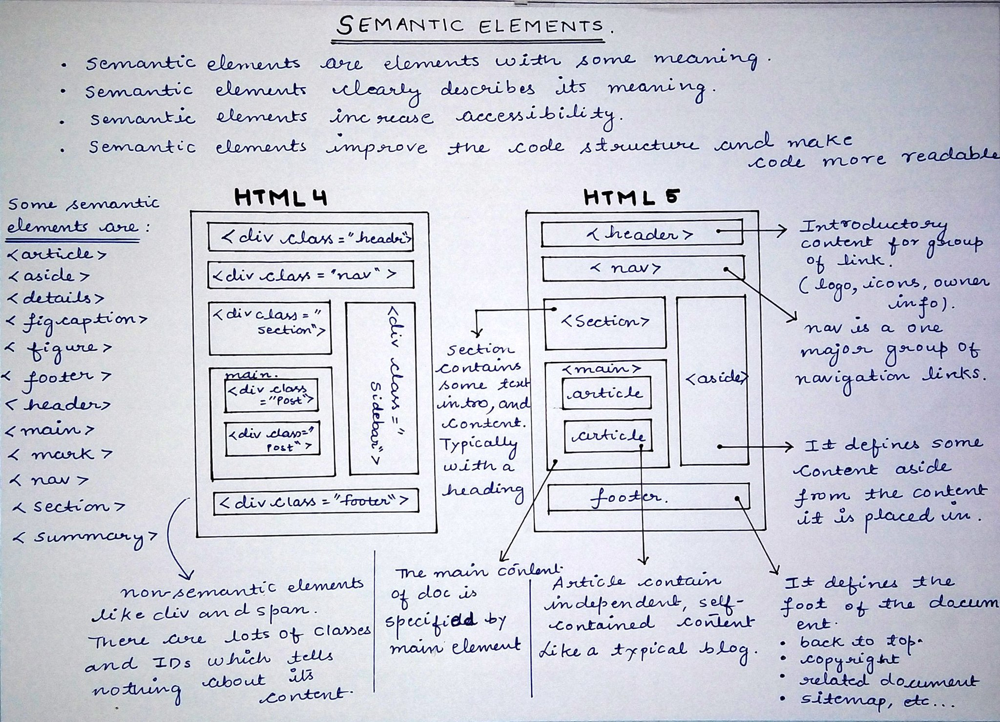Semantic elements(시맨틱 엘리먼트)는 'header', 'footer', 'article', 'section'과 같은 태그를 포함하며, 이들은 각각의 엘리먼트가 가지는 의미에 따라 사용된다. 예를 들어, 'header' 태그는 페이지나 섹션의 머리말을 나타내며, 'footer' 태그는 바닥글을 의미한다. 이러한 의미론적 구조는 웹 접근성을 향상시키고, 검색 엔진 최적화(SEO, Search Engine Optimization)에 기여하며, 코드의 가독성을 높인다.