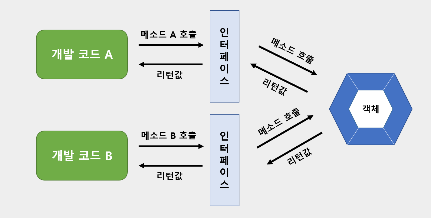 개발코드에서 인터페이스의 메서드를 호출하면, 인터페이스는 객체의 메서드를 호출하고 개발코드에 전달한다.