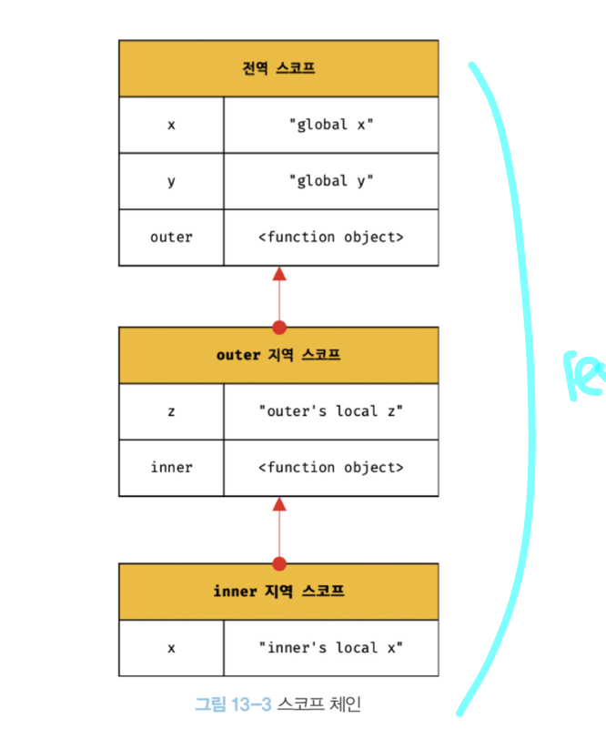 JS 엔진은 변수르 참조하는 코드의 스코프에서 시작하여 상위 스코프 방향으로 이동하며 선언된 변수를 검색합니다. (상위에서 하위로 내려가는 일은 X) 이는 상위 스코프에서 유효한 변수는 하위 스코프에서 자유롭게 참조할 수 있지만 하위 스코프에서 유효한 변수를 상위 스코프에서 참조할 수 없다는 것을 의미합니다.