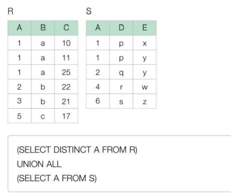 r 테이블에서 중복 제거해서 1,2,3,5 4개이고, s 테이블 전체 1,1,2,4,6, 합집합해서 9개