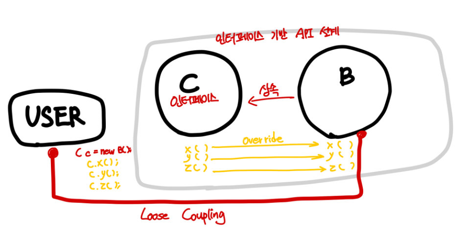 : C는 옵저버로서 인터페이스 역할을 한다. Java에서 만든 인터페이스(C)를 override해서 벤더 측에서 API(B)를 작성하고, 사용자는 재정의된 인터페이스의 메서드를 이용하면 사용자가 모든 B의 API 활용법을 알 필요는 없는 것이다.