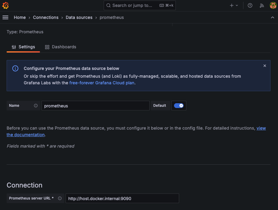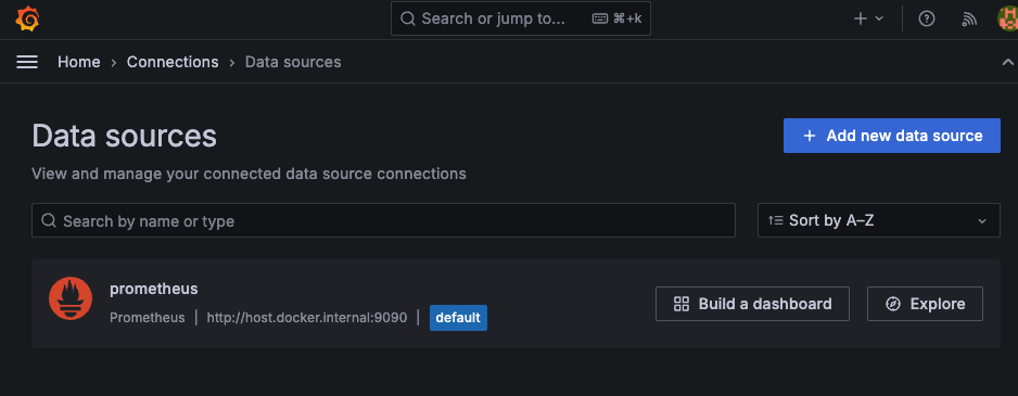 data source 목록에서 추가한 prometheus를 찾을 수 있다.
